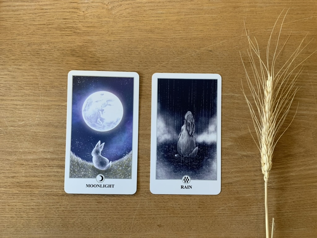 ที่มีความหมายว่า “คุณมีความกระจ่างแจ้งในใจ” และจับไพ่ใบที่สองได้ Rain ที่มีความหมายว่า “ชำระล้างความรู้สึกหนึ่งด้วยความรู้สึกหนึ่ง” หากนำสองใบมารวมความกันก็จะได้ความว่า “ตอนนี้คุณจิตใจกระจ่างชัดแล้วเพราะได้ล้างความรู้สึกไปจนหมดสิ้นแต่นั่นก็เป็นจากความรู้สึกหนึ่งไปสู่ความรู้สึกหนึ่งแต่นั่นก็ทำให้จิตใจคุณแจ่มใสอยู่ดี”